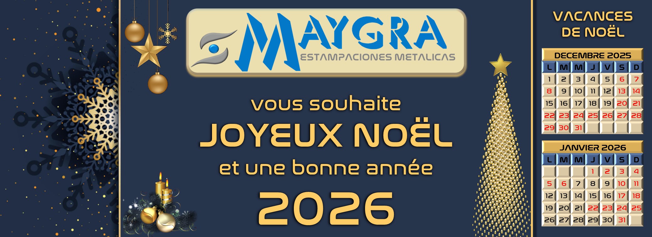 05 Déc Vacances de Noël Posted at 12:22h in Nouvelles by EditMaygr Toute l’équipe MAYGRA vous souhaite de joyeuses fêtes.